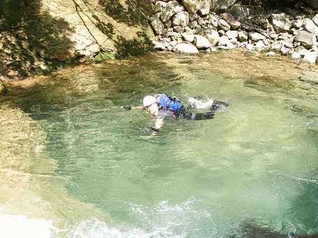 そこからはまた、ナメ滝+大釜の連続だ。難しい滝もなく、フリーで滑ったとしても大釜にポッチャンといくだけなので冒険心も旺盛、へつらないで大釜をスーイスーイと泳いでいくのもOK。これでもか!!と続く、美しい滑床とエメラルドグリーンの釜。素晴らしい遡行を楽しみながらいく。