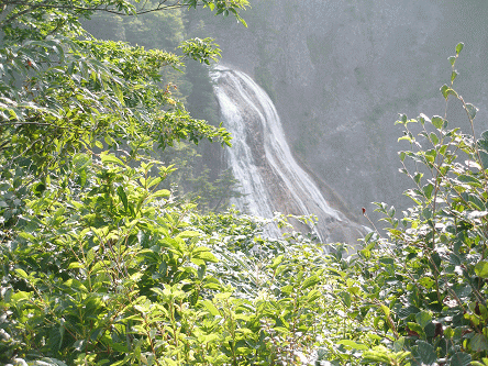 ここで、大休止とし、あとは夏道を下るだけとなった。夏道は鉱山だっただろう古い跡が残っており、トロッコの軌跡を下る。途中の大滝展望台にも鉄の大ヤグラが残っていた。展望台からの大滝はヤブの中に遠くに見えた。せっかくなので、ヤブ払いをすればいいのにと思ったが、ベロンと見えるより神秘めいて良いのかもしれない…と勝手なことを考えていた。ここから大滝直下まで下る道がついている。名滝は苦労して直下まで行き、見上げたほうがよりすさまじく見えるのだ。