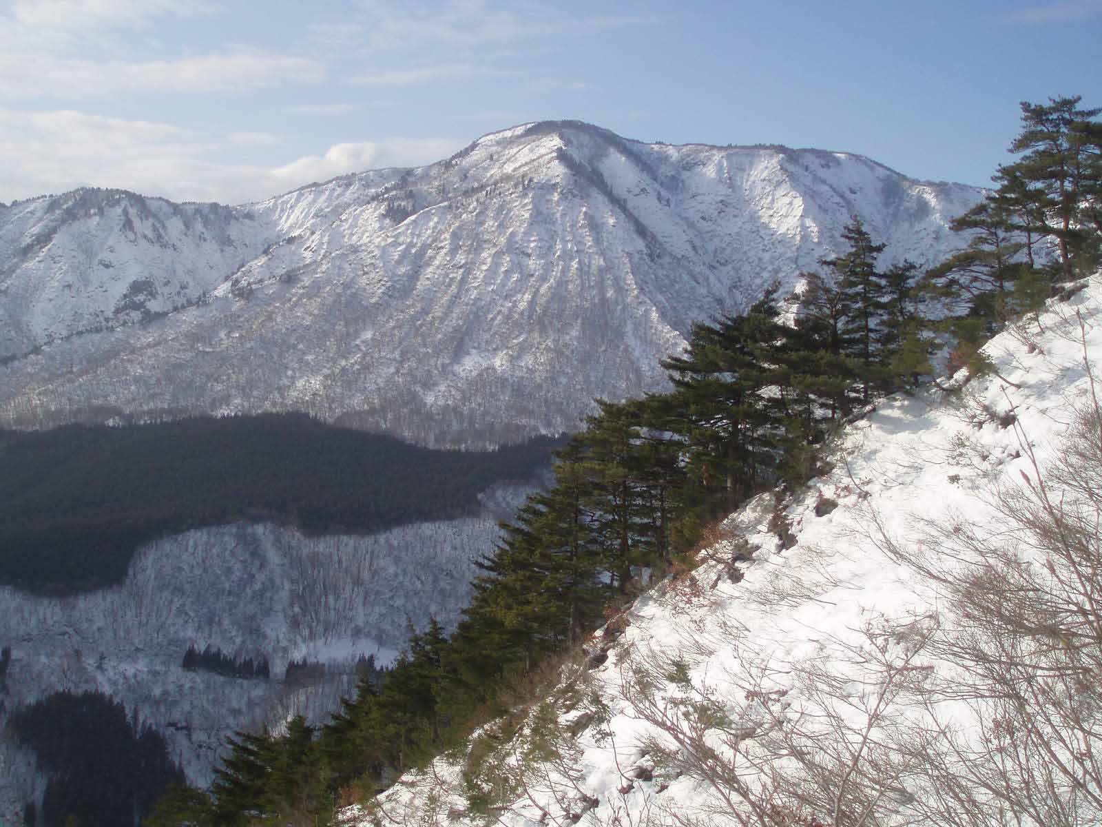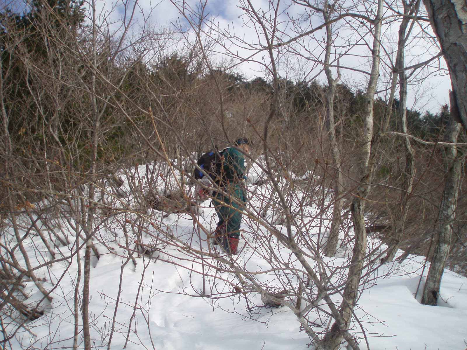 雪もだんだん深くなり、歩きにくくなったので途中F以外はワカンを装着する。Fはワカンをもってはいるが、ツボ足でがんばるようだ。上部は遠くから見た通り急登となり、枝につかまりながら登る。標高はあまり高くないのだが、思ったよりきつい山だ。