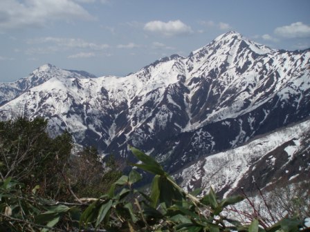 朝6時に高速の黒崎パーキングで待ち合わせ、車2台で六日町の十字峡に向かう。三国川ダムの管理施設を過ぎ右岸を進んでいくとバリケードもあるが、とりあえずという感じなので気にせず通り抜けた。先着車が数台止まっている十字峡の駐車スペースに付き、登山の支度を始める。俺とOは残雪期の登山道の無いルートが混じるので、アイゼン、ピッケルはもちろんのこと万一の場合も想定しスワミベルトをつけ、30mのロープも携帯した。泊まりの装備とあいまって日帰りとは違う重いザックに体をふらつかせながらトボトボと林道を歩き始める。所々のデブリを慎重に通過し30分ほどで丹後山の登山口に着いた。最初から、かなりの急坂となりゆっくりと地面を踏みしめながら登る。辛い登りが続くが芽吹いた樹木の新緑が残雪の景色と重なりとても美しい尾根だ。