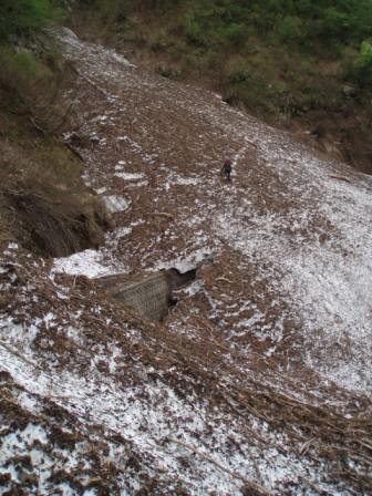 やがてこの尾根の登山口である内膳落合に降り立つ。ここからは、十字峡までは平坦な林道のはずだったが所々のデブリの通過には難渋することになった。