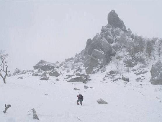 天気は曇り。小雪がちらついていて寒い。針葉樹林の中を歩き出す。雪はサラッと振りかけた程度にしかない。だが、西ノ平を過ぎると急登が始まり、標高が上がるにつれ雪も多くなってくる。旭岳は祠のある小ピーク。そこからはさらに傾斜が増し、ジグザグ登りになる。北アの燕岳の合戦尾根を思い出させるような登りだ。同じ燕≠セからなのだろうか。