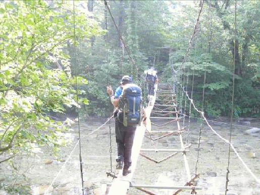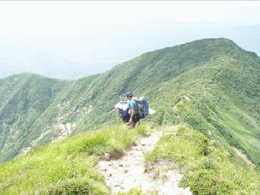 すぐに荒川に架かっている大石橋を渡る。板一枚が乗っかっているだけの橋だ。しばらくはブナの原生林を行き、大朝日岳との分岐点から祝瓶山への尾根道に入る。夏の青葉で日差しは遮られているが、急登なので汗が滴り落ちる。当たり前なのだが、急峻な山容の山は急登だ。