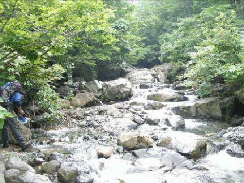 登山道は荒れてなく歩きやすかった。途中のブナ林も素晴らしかった。急斜面を下り切ると、朝通過した北沢に戻った。暑い一日の沢登り、緊張感もあり楽しい。やはり、ワンシーズンに数回は適当な沢で遊びたい。それにはトレーニングをせねば…。