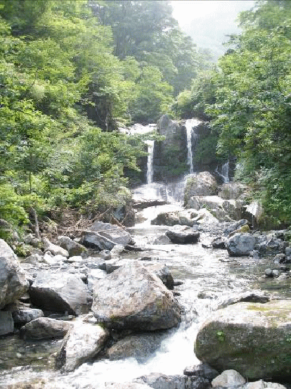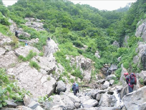 沢が右折するところの7mの滝は、傾斜は強いが右壁が階段状になっているのでそれほど困難ではない。次の10mのナメ滝は水流沿いは滑って登れそうもないので、左壁のクラックを登る。