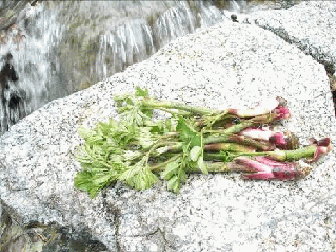 雪渓が残っているところで小休止。あたりを見渡していると、急斜面にウドを発見する。真夏にウド、それも食べ頃のやわらかそうなウドだ。ベト状の急斜面なので登れそうもないので諦めかけていると、仲間が数本採ってくれた。さすがである。