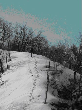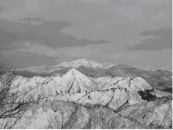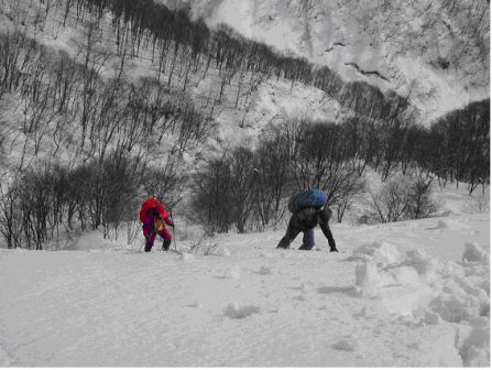 装備を点検しここから徒歩5分ほどで守門川を渡り登山道にたどり着く。早速、ワカンに履き替えて杉林の木立を通り抜ける。急登を経てなだらかな稜線に抜け出すとテレビの共同アンテナが目に入った。葎谷集落を右手に見ながら、さらに奥へ進む。痩せ尾根を通過すると、枝をつかんで腕力勝負で急な登りが始まった。登り初めて1:40時間でようやく芝倉山に到着。さらにここから猿ケ城を目指すが、腹が減った。行動食を口にしながら、仕切り直し。リーダーが地図を片手に猿ケ城へのコースを慎重に確認する。途中、先頭に立ての“指令”でラッセル役を担当するが、30分で息が上がってしまった。頂上手前の最後の登り。覆いかぶさるような急斜面を見上げて一瞬、躊躇してしまった。おそらく30度はある雪の壁である。直登はきついのでジグザグで刻む。日差しが強く、雪も緩んで登りづらい。息も上がり、最後は腹ばい状態で急登をこなし、ようやく猿ケ城山頂に到着した。山頂からは粟ケ岳、白山、白根山などが確認できた。動物の足跡も人の踏み後もない全く静かな山だ。