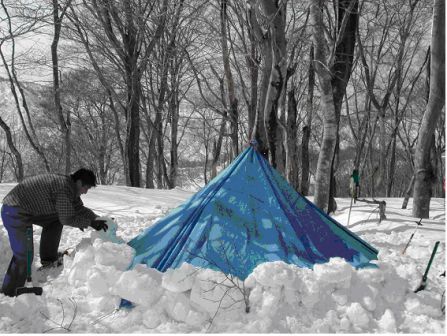 早速、スコップで雪を掘り、ブロック状態で周りに積み上げた。さらにその上にターフを吊して“簡易ベースキャンプ“のできあがり。十分すぎる昼食の後、下りは赤布に注意しながら下山した。近くの「いい湯らてい」(入館料850円)にて汗を流す。午後5時以降は650円のタイムサービスがうれしい。