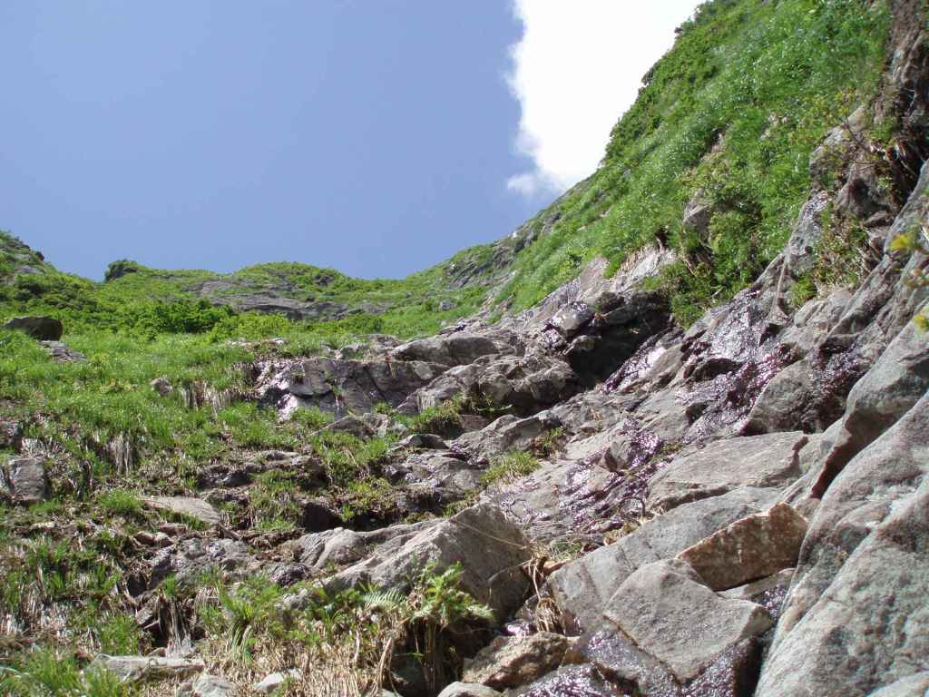 休んでいると男女の二人組みが追いついて白毛門沢に入っていった。後を追うように東沢本流から左の白毛門沢に入る。最初の小さな滝が現れるが登れそうもないので左のふみ跡を追って小さく高巻いて超える。その後の滝は順調に越えていく。天気もよく気持ちがいい。何段かある大きな滝が見えてきた。最後にかかる大きな滝がタラタラのセンと呼ばれる滝だが、さすがに登れる気がせず、先行の男女の二人組みに続き高巻き道に入る。後ろから7~8人のパーティも登ってくるのが見えてきた。沢の高巻きはだいたい急だが、ここも急峻で木をつかみながら登る。途中で道が解からなくなり枝沢を登り始めたがどうも違うような気がして、登ってきた沢を下って戻りあちこち探しているうちにやっと本流に戻る場所が見つかった。道ではないので解かりにくい。やれやれ30分位ロスしてしまった。後続の7、8人のパーティーからも抜かれてしまったようだ。一息入れさらに進んでいくと大岩のあるナメ滝に出る。大岩の前には釜があった。汗をかいていたので釜に入り全身を浸したが、さすがに冷たかった。そこから先は沢も細くなって行き、やがて二股という分岐についた。ガイドブックにある通り右の支沢に入る。白毛門と手前のジジ岩、ババ岩が見えているがまだ遠い。どんどんつめていくと、え~聞いてないよと言いたくなるほどのデブリの雪渓が長々と続いていた。仕方なく沢靴を脱ぎ、トレッキングシューズに履き替えとぼとぼ登る。ピッケルがほしいような急な登りだが、土埃が被っていてある程度の滑り止めになっていたのは幸いだった。雪渓が終わると今度はスラブ帯だ。ここはある程度急で高度感もあり爽快に登れる。そのまま草つきで白毛門山頂へ突き上げるが、このへんになると大分疲れてきてアヘアヘの状態だ。