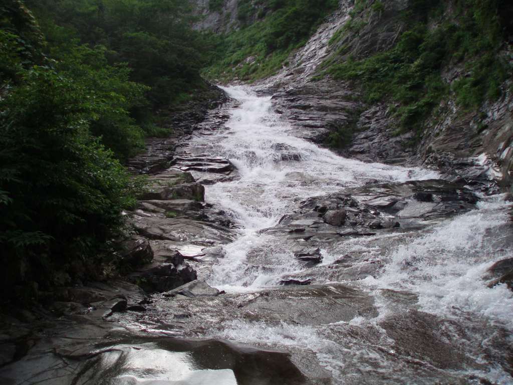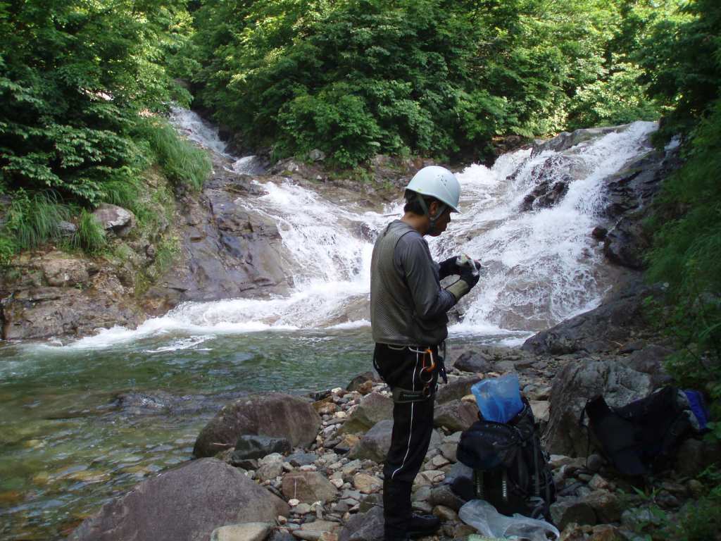 朝3時30分に家を出て、OGUを迎えに行き高速に乗った。久しぶりの早起きで少し眠かったが、久しぶりの沢登りとなるので、山に近づくにつれ期待が高まり、目が冴えて来た。土合駅近くの白毛門登山口の駐車場はかなりの車が駐車していた。一旦車を降りて入渓地点を確認し、白毛門登山道の入り口近くに車を止め、沢靴を履き、ハーネスや金具類は手に持って歩き始める。白毛門登山道に入らず、右の林道を行き、堰堤を越えたところで沢に下りる。少し行くと対岸に道があり、森の中を歩いていくと再び沢に入るが、ここが入渓点だろう。ハーネスと金具を身につけ沢の中を行く。一ケ月前に行った五頭の小倉沢とくらべると明らかにスケールも大きく、ナメ床に流れる清流が美しい。30分位行くと傾斜はそうないが大きな滝が現れた。ハナゲの滝だ。水量はかなり多く、迫力がある。滑ったら下まで流されるだろうと思うぐらいだ。左側を登り、上部で水流の右側に抜けた。さらにしばらく行くと白毛門沢出合に着いた。