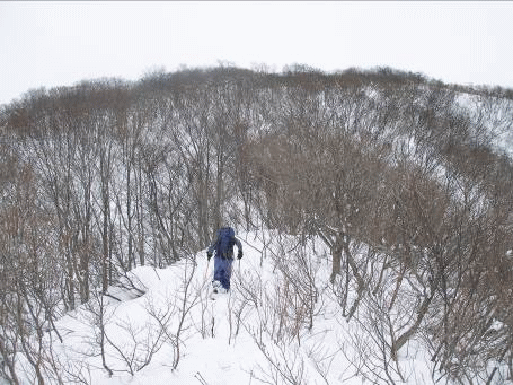 トレース跡を行くのは楽だった。今までの辛かったラッセルが嘘のように快適に歩けた。ほんの数分で山葵山に着く。念願だった山頂になんとか着くことができた。高曇りの天気で、1月に歩いた松平山への尾根もよく分かる。山頂には先着した1パーティーがテントフライを広げて休んでいる。私たちは少し下った所でツエルトを張り大休止とした。