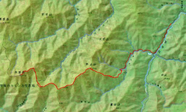 その後、魚止山迄は辛く何度も休んだが、なんとか下りきり、林道終点に降り立った時はほっとするとともに、念願の矢筈岳に登頂できたたことに