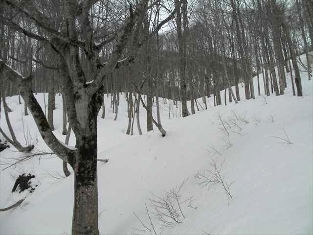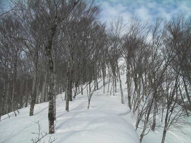 842m標高点の尾根と合わさり,やがて尾根が収斂すると灌木帯も終わり,ブナが明瞭となる.