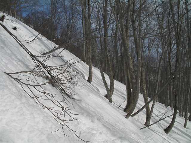 杉林に至る細尾根は,さすがに雪が切れているところがあり,雪庇側を歩いていると,見事に隠れた雪の切れ間にはまる.