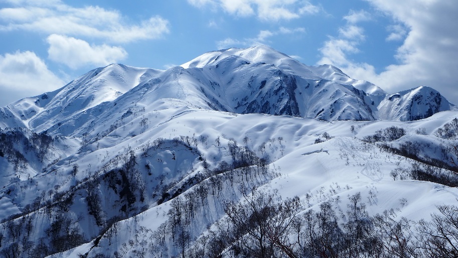山頂は風もなく、周囲の山々を眺めながらのんびりしていたが、少し雲が出てきたので腐った雪の中を下る。