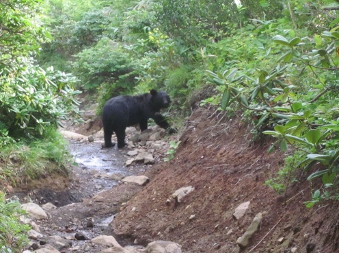 ムーミン谷からは順調に下山しあと30分で登山口という所で真っ黒いクマに遭遇。クマの鼻息が聞こえる距離5~7m、恐怖の20分を体験した。