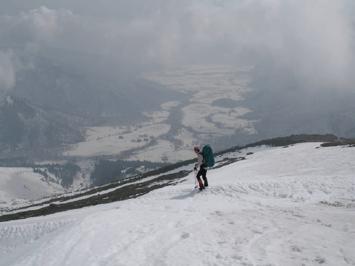 <5/4>朝は深いガスの中だったが、テントを撤収し、歩き始める頃にはガスも切れ始めていた。小至仏山を越え、至仏山へは雪面を拾いながら登る。至仏山山頂も雪は付いていなかった。流れるガスの中、尾瀬ヶ原の奥に燧ヶ岳が見え隠れするだけで、奥利根源流の山々は雲の中に隠れてしまっていた。