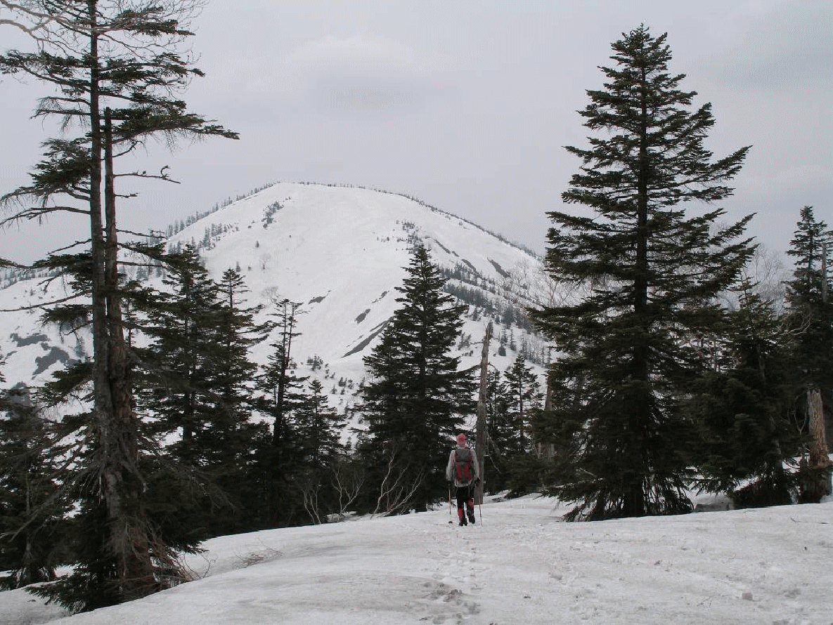 1640mの鞍部近くまで下りると広い尾根になり雪原のブナの林となる。右手には猫又川が近くに感じられる。天気は回復してきていた。主稜線から飛び出している赤倉岳が目の前に存在を誇示していた。振り向くと、至仏山がドデーン!!とこれでもかくらい大きく聳え立っていた。反対回りで至仏山を登るコースは考えられないくらいだ。