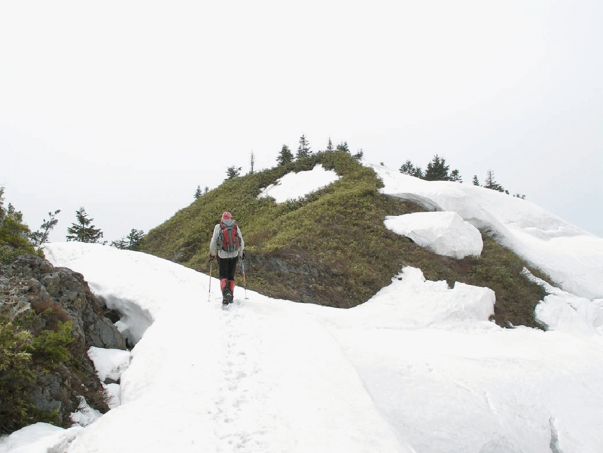 まずススヶ峰山頂に登る。山頂湿原の一部が顔を出していた。何回かこの連休に来ているが、初めてだ。やはり今年は小雪だったのだろう。ススヶ峰から広い針葉樹林帯の山腹を下り、尾根に乗る。1761m鞍部から赤倉岳の登りとなる。足跡が無数付いている雪の急斜面を登りきり、ヤブが出ているヤセ尾根を行くと、赤倉岳の山頂だった。山頂ではかわいらしい道標が私たちを迎えてくれた。