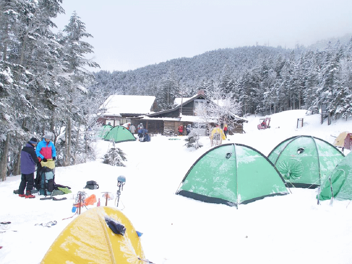 仲間のテントの横に私たちもテントを設営する。ここのテント代も一人1000円、だが、流水がなく、なんとなく損をした気持ちになる。だが、積雪期はこれが普通で仕方がない。この日は新年顔合わせになり、大いに盛り上がった。