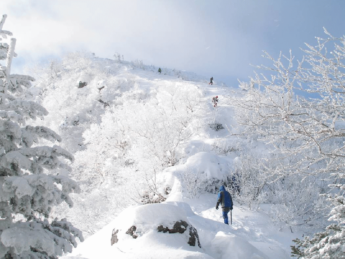 翌朝もガスの中だった。アイゼンを付けて出発する。中山峠から稜線に上がると、強風にさらされる。登っていくうちにガスは晴れ、東天狗が姿を現し始めた。上部は雪煙も舞っているようだ。登山者の姿もたくさん確認できる。岩稜が交じる急斜面を登っていくと、山頂に着いた。