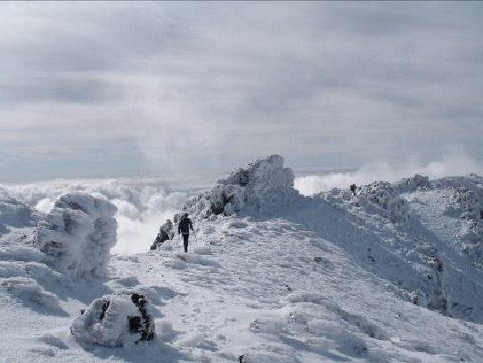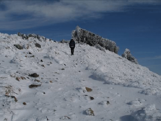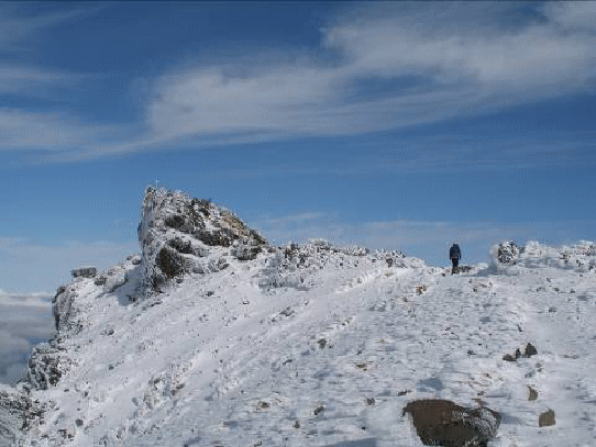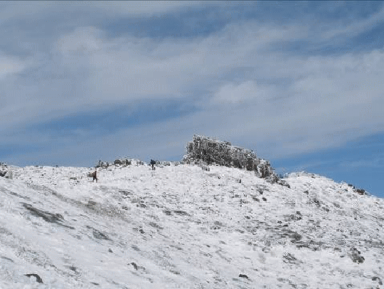 翌日は晴れとなった。山頂付近は新雪で白い。空身で小屋を出発する。9合目の霧ヶ平の上あたりから雪を踏みながら行く。降ったばかりだろう新雪、火口壁では雪が10cmほど積もっている。雪の白、空の青、そして、登山者のカラフルな服装と、色のコントラストが美しい。