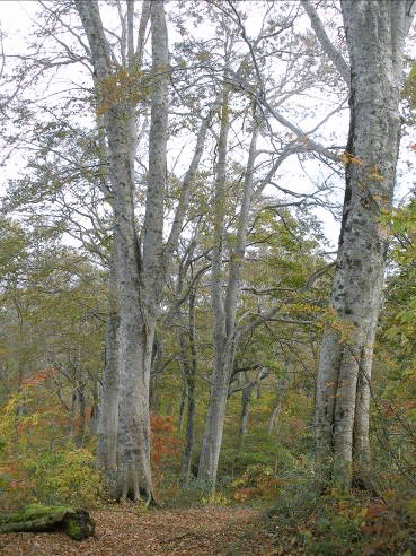 登山道はブナ林の中を登る。端正なブナの木々は紅葉の盛りを迎えているようだ。このコース、滝見場の大倉、タッチラ坂(ダケカンバの意だそうだ)、屏風岩、とちょうどよいピッチで休み場になるところが出てくる。屏風岩を過ぎると唐獅子小屋も近い。去年より3週ほど時季が遅いので、下のブナ林紅葉は見頃だったが、小屋に近くなるにつれ葉は落ち、冬枯れの装いとなっていた。