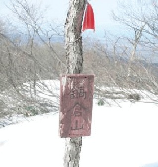 750mで主尾根になるが、その手前あたりから雪を踏み始め、鍋倉山まで来るとやっと雪一面の世界となった。先行者が数人いるらしく、トレース跡が残っている。鍋倉山から上はブナの林が広がり、尾根の傾斜も緩くなってきた。このルートは残雪期ルートでやはり人気があるらしく、木のペイントや目印テープがたくさん付いている。目印テープは高い所に付いており、今冬の小雪を顕著に表していた。