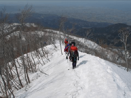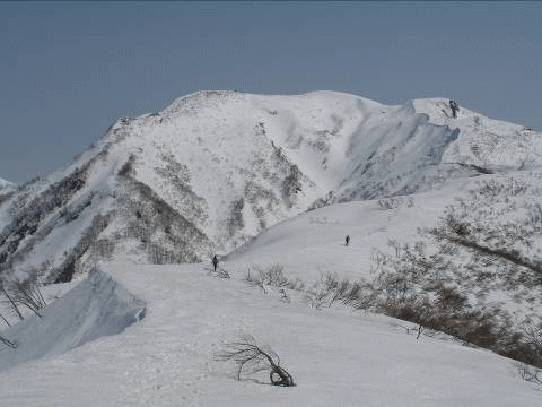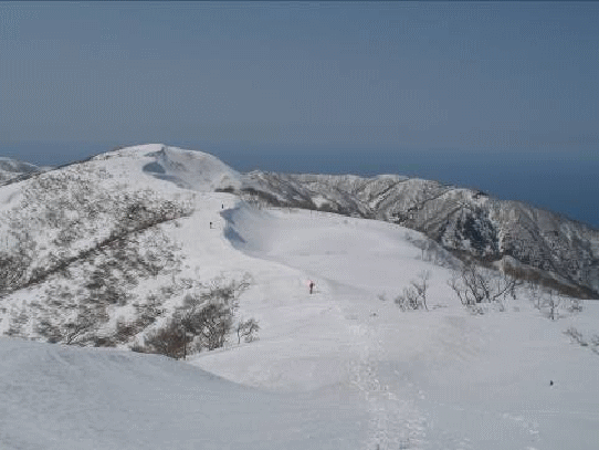 地図上だけで三角点や標高点ピークだけでも5個ある。天気が良いので迷う心配はなかったが、途中の雪庇が張り出し、危険だろう箇所も小雪でほとんど無いに等しかった。アップダウンを繰り返し、雪原が広がる尾根をひたすら歩くが、ゴールピークの初雪山はなかなか近づいてはくれない。途中で下山パーティー3組とすれ違う。朝は冷え込んだので、アイゼン無しでは登れなかったそうだ。