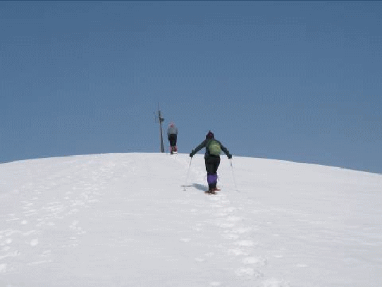 最後の200mほどの急登を終えると、真白く輝いている初雪山の頂上鞍部に出た。電波塔(?)がよく分かる。残り50mの登りで山頂に着いた。やっと着いたという感じだった。風が強く冷たい。