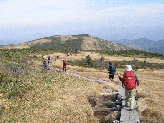 登山道は中急斜面が延々と続く。今回は100人近くも参加しているのだろうか、登山者も延々と続いている。森林限界を越え、湿原が現れたと思ったら玉子石分岐となった。私たちは早く山頂に着きたかったので玉子石は帰りに寄ることにし、山頂へと向かう。