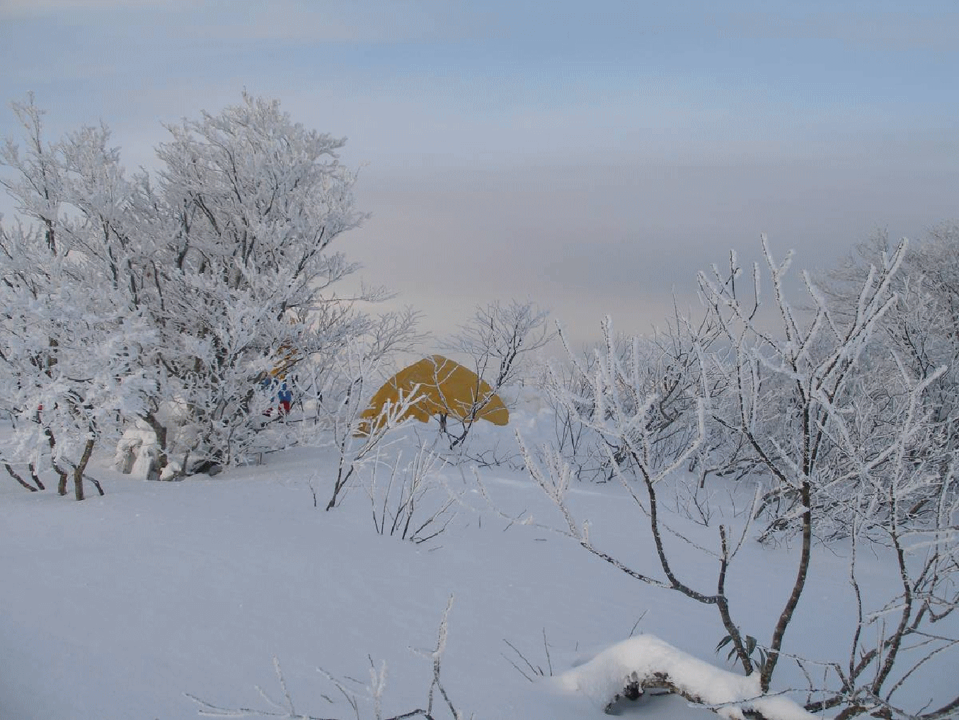 野須張のテン場で急いでテントを撤収して下山する。日帰り組が登ってきているはずなので、お昼のテントを大蛇山の下で張りたかった。山頂を出たあたりから雲が広がり始め、大蛇山では雪が降り出す。良いタイミングで下山したものだ。大蛇山の下りで日帰り組に会う。お昼のテントは641m水準点の手前、700mピークあたりの尾根が広くなっているところに張る。天気は急激に悪くなり、テントを設営する頃には風が強くなり、雪も勢いを増してきた。