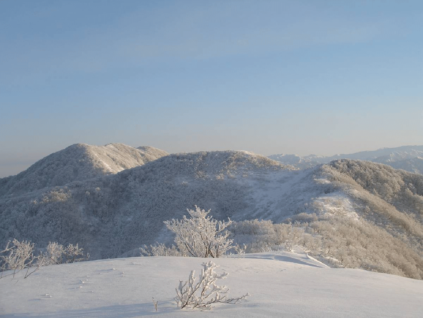 主稜線もここまで来ると雪原が広がっている。白い雪に覆われた尾根、点在する木々には樹氷が付いて、より美しさをかもし出している。天気が良ければ最高の山となる。菱ケ岳から大日山、野須張に続く尾根が正しくそれだった。振り向くと、カモシカが2頭、尾根を横切るところだった。冬毛に覆われたカモシカ、栄養を蓄えているだろう体は少し重たそうだ。つがいなのだろうか、カモシカが複数でいるのを始めて見た。