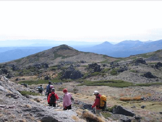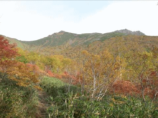 カムイ天上分岐から03年に開かれた新道を行く。尾根上の緩やかな道で展望もよく、気持ちよい。十勝連峰の多分(?)美瑛岳、十勝岳、富良野岳だろう連山が見える。登山道はいったんコマドリ沢に下り、前トム平に登り返す。コマドリ沢周辺は夏には高山植物が群落を成すのだろう。紅葉もこのあたりが一番の見頃のようだ。ブナはないが、ナナカマドの赤やカエデ系の黄色が美しい。
