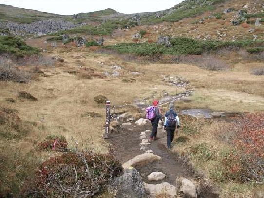 トムラウシ山 短縮登山口5:30 − コマドリ沢8:10 − トムラウシ公園9:50 - トムラウシ山頂11:20 〜 11:40 − 前トム平13:05 − カムイ天上分岐15:00 − 登山口16:00前トム平13:05 − カムイ天上分 岐15:00 − 登山口16:00