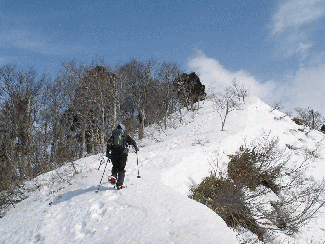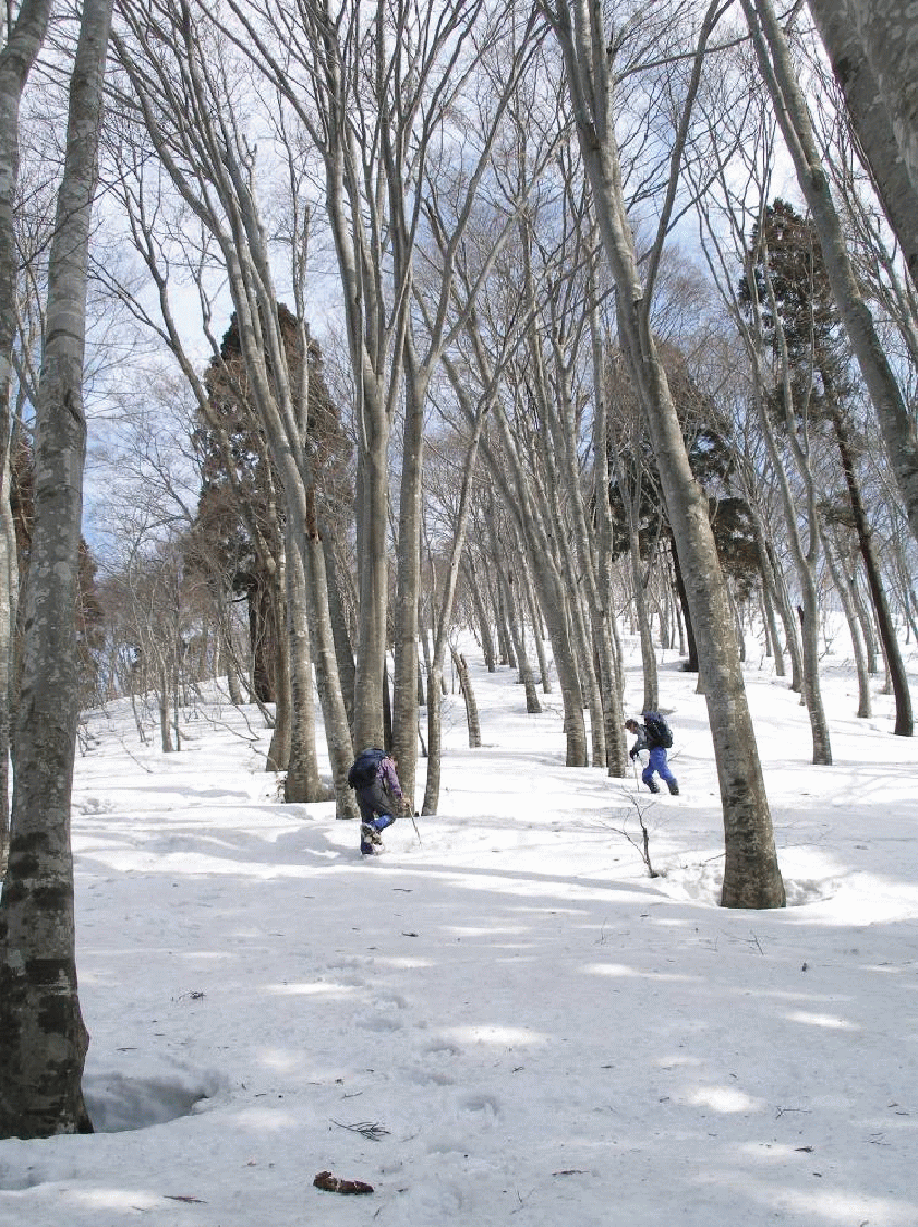 ブナ林の中を馬ノ髪山との稜線を目指して行く。雪も締まっていて歩きやすい。760mピークから少し下り、山頂への急斜面にかかる。クラストしていると大変だろうが、今回は適度にもぐるので都合よかった。