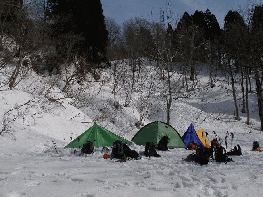 全員で記念撮影をして下山にかかる。日は陰り始め、風も出てきていた。稜線から外れ、ブナ林の上部で昼用のツエルトやテントを張る。昼食の前に講習会。昼食を終え、出発する頃にはガスが湧き、車に戻った時には雨となった。