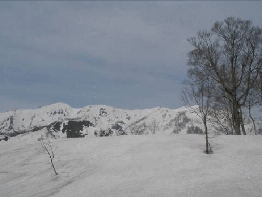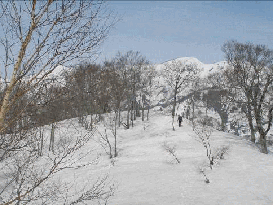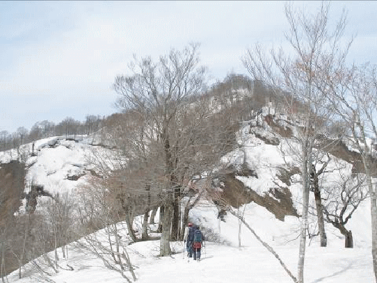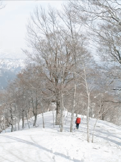 ここから山頂は山スキーのパラダイス!!となる…わけではなかった。尾根はまた細くなり、急斜面を登る。代塚山山頂下でやっとブナが点在する斜面が広がってきた。先回私たちが登った尾根が伸びている。個人的には山スキーにはこちらをお勧めしたい。