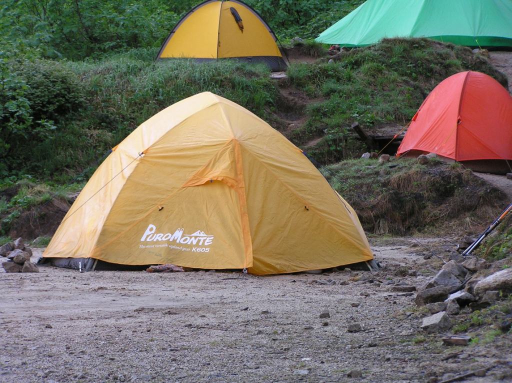 テント設営時周囲に溝を掘ったりするが、夜半の降雨では意味をなさなくなっていた。