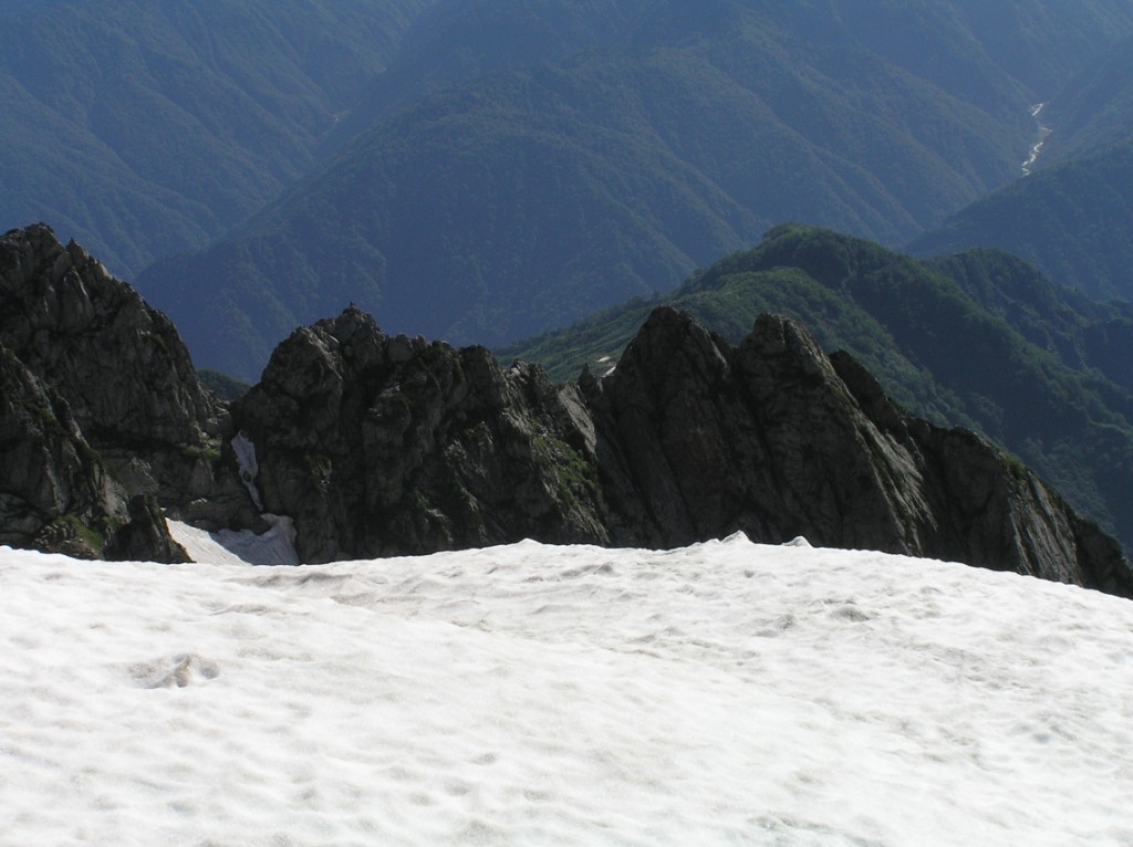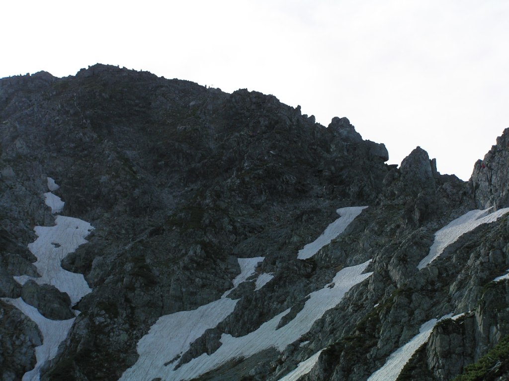 いよいよ剱の頂上へと歩き出す朝を迎える。朝食は、あまり空いてはいないが、とにかく腹に詰め込む。空身に等しいザックで上へと向かう。ここで朝一番の歩き出しなのに、怪物のA会長は、ハイペースで歩き始める。やっぱりこの人は、負荷をかけないとダメなのだ。このペース配分では、到底山頂まではいけないので、マイペースで歩くこととする。緊張感の中、いつでも戻る気持ちを持ちながら、カニのハサミ、獅子頭とはどんな場所なんだろうと頭の中に思いめがらせながら進む。途中、雪渓あり、落石ありでかえって鎖場のほうが安心できたのは不思議でならない。