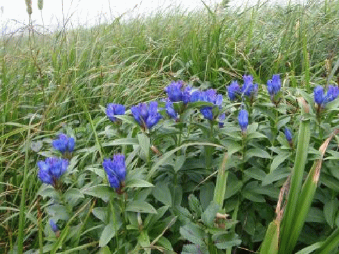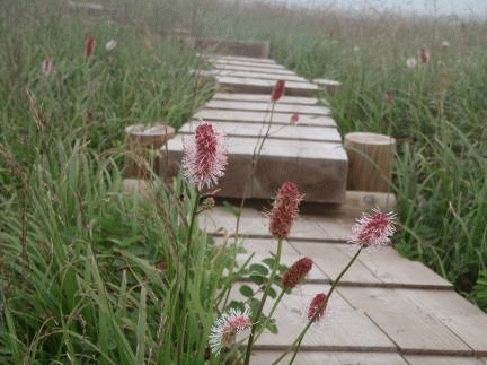 河原宿小屋のあたりはガスが深くなり、視界は利かない。ここから千畳ヶ原方面に向かう。なだらかな湿原には秋の花々が咲いている。チングルマの穂が多く、季節がよければ群落になっているのだろう。数年前にはなかった木道が続く。左手に見えるこんもりとした山(丘?)が月山森だ。ボタ池を過ぎると、月山森への分岐点となる。
