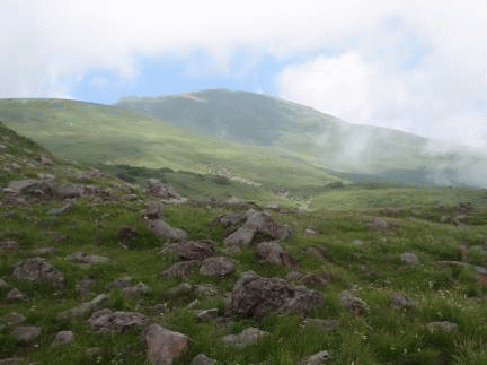 分岐点から数分で、ピークに着く。何もないピーク、ただ遭難碑だけが鳥海山を背に立っている。ここが月山森の山頂だろう。ガスが流れ、展望は利かない。晴れれば鳥海山本峰がドデンと見え、展望を楽しむことができるだろうに残念だ。少し休憩し、山頂を後にした。来た道を戻る。河原宿小屋の手前でガスが少し切れ、鳥海山が姿を現してくれた。