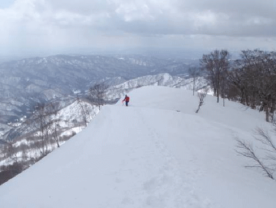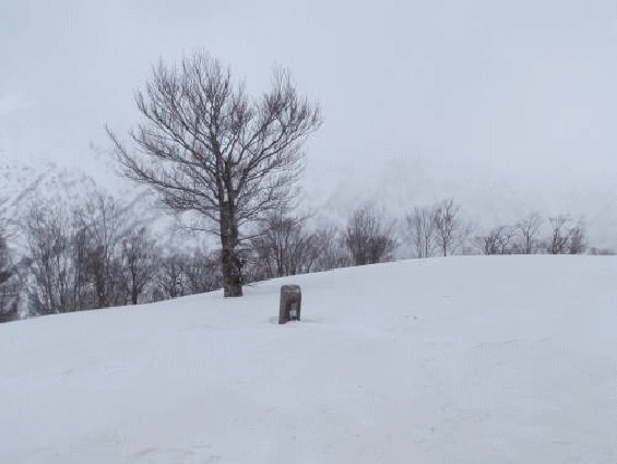 ここで仲間はワカンを付ける。風が強く寒いので、雨具を着て歩き出す。上に行くにつれ、ブナの林が広がってくる。アツラノ峰からの尾根と合わさる手前あたりからブナの原生林が広がる斜面となるが、傾斜も増してくる。天気も雪模様となり、視界も利かなくなってきていた。