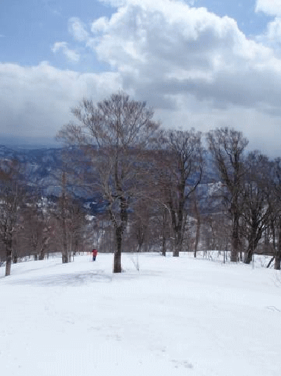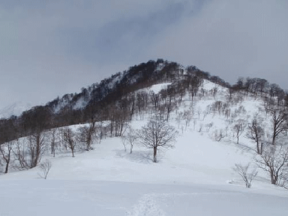 車を集落の学校跡に止めさせてもらい、準備をする。アレレ、自分のストックとワカンを忘れたことが判明。ストックは1本借り、ツボ足で登ることにする…無いのだから仕方ないのだが、心細い出発となった。天気は曇り。上は風が強いようで雲の流れが速い。だが、雲間からは時折青空が顔をのぞかせてくれていた。