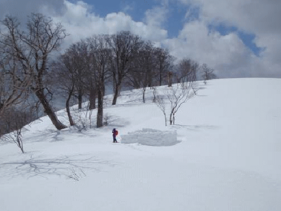 稜線に15分ほどで出た。風はやや強いかな、といった程度。ここからピークをいくつか越えて山頂となる。稜線上は雪が硬くクラストしている。長靴なので急斜面になると滑って怖いくらいだ。宿泊隊は稜線上でテントを張ったとのことだが、歩いてもなかなか見つからない。見落としたのかな?なんて思っていたら、尾根が広くなった1175mの鞍部に雪の要塞?雪の壁?雪の塀?、ドでかい雪ブロックの風除けが現れた。高さは1m2、30くらいあるだろうか、4、5人用テントが十分に張れる広さだ。昨日は相当早くに着いたのだろうか。よりによって風が吹き抜ける場所にねぇ。でもこれだけの雪ブロックだったら台風クラスの風でも大丈夫かもしれない。
