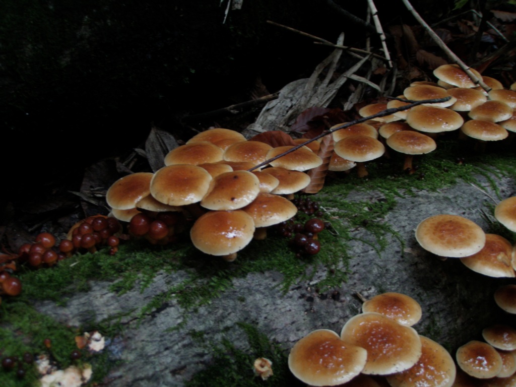 リーダーY井氏を先頭に。早々小川あり。私はうまく渡渉できず2〜3回ポチャ。その後、ヘつりの連続で少々ヒヤヒヤでした。ブナ林の黄葉がとてもきれいでした。お日様が照っていたらもっと映えていたのにと少し残念でした。早々ナメコを発見。つやつやとおいしそうに輝いていました。Y井氏の次がきのこ取りのお得な順番で順位争いが大変?でした。A会長の傍もお得な順番でした。