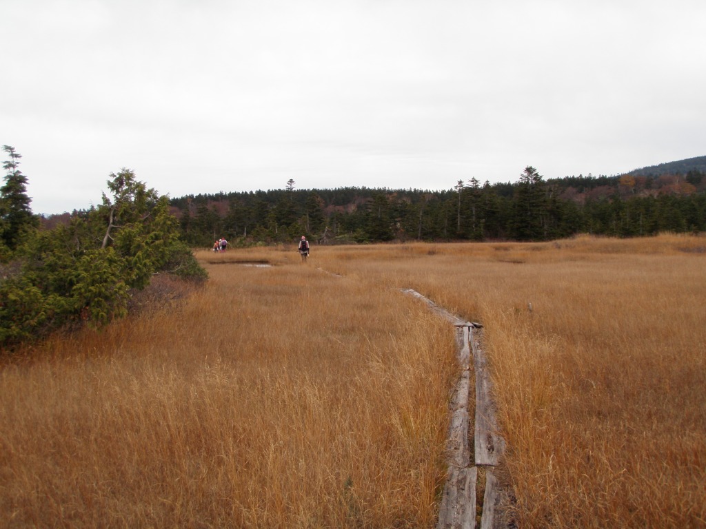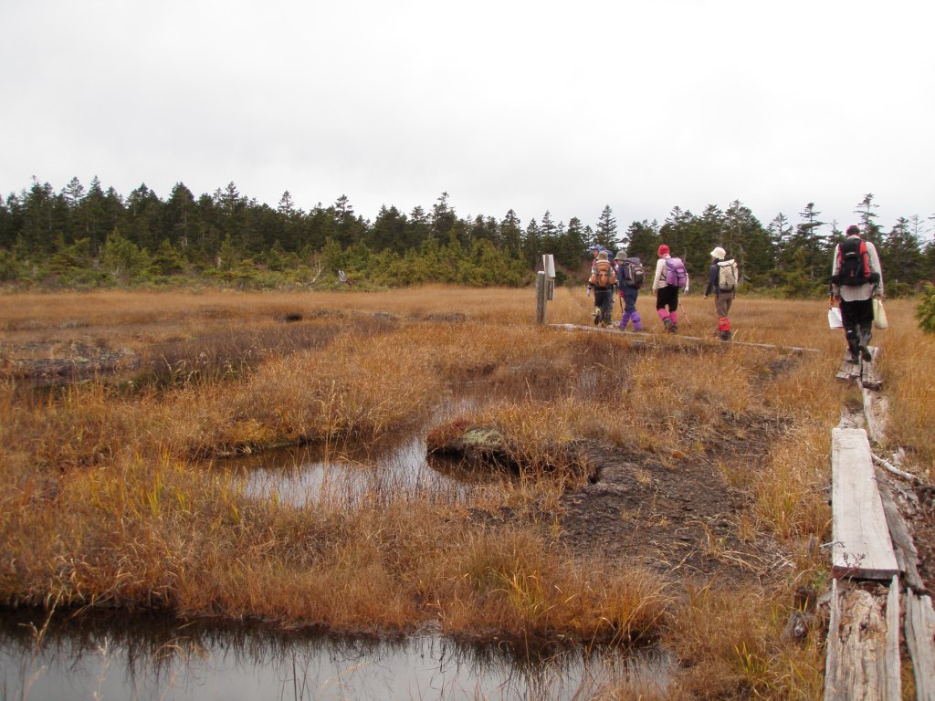 その後なだらかな道で、木道に取り付く前に急な階段が何箇所かありました。(ハーハー)木道に取り付くと、草紅葉と池塘と周囲の山並みのコントラスがなんとも言えず、晩秋のうら寂しさが乙女心?を・・・・・・。ロマンチックでした。この時は曇り空で良かったと思いました。登りは私たちのみでした。きのこ取りにはラッキーでした。