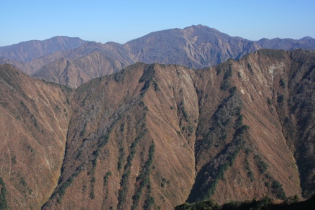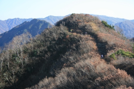 万ノ助山のピークによる。ここからの眺めは絶景だ。ここから一時間ほどダウンアップ(下りが先なので)を繰り返し光明山の山頂に到着する。Y井さん、その他に3人がいた。結局追いつくことはできなかった。見晴らしの良い山頂でビールを飲みながら歓談する。あーこれがあるから山はやめられない。至福のひと時を過ごし、名残惜しく山頂を後にする。下山はほとんど休憩なく歩いても2時間半近くかかり、登りと大差ない時間を要した。