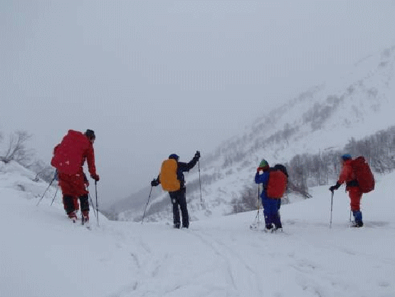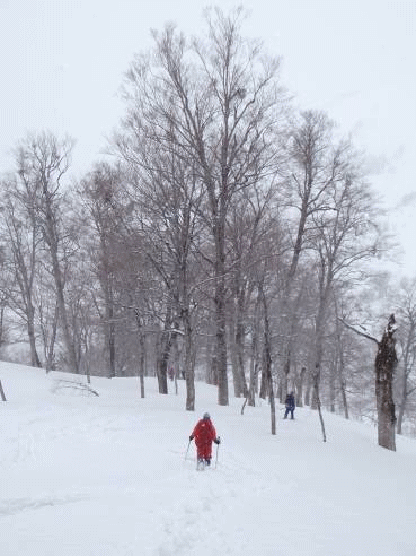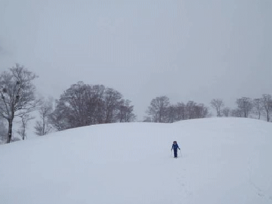 下りは山スキーには最高の斜面が続いていた。ブナの大木が点在する斜面を快適に滑っている。正に山スキーのパラダイスだ。私たちも快適に下っていく。天気が良ければ、青空に映える白いブナと悠大な雪の斜面は「ヤッホー!」と叫びたくなるほど素晴らしいのだろう。来季もぜひ登りたい山となった。それも晴れた日に登ってみたい。