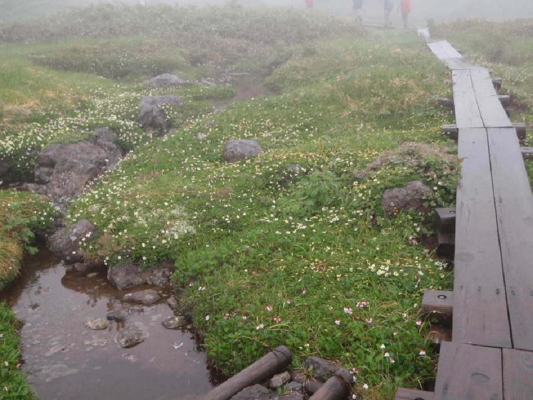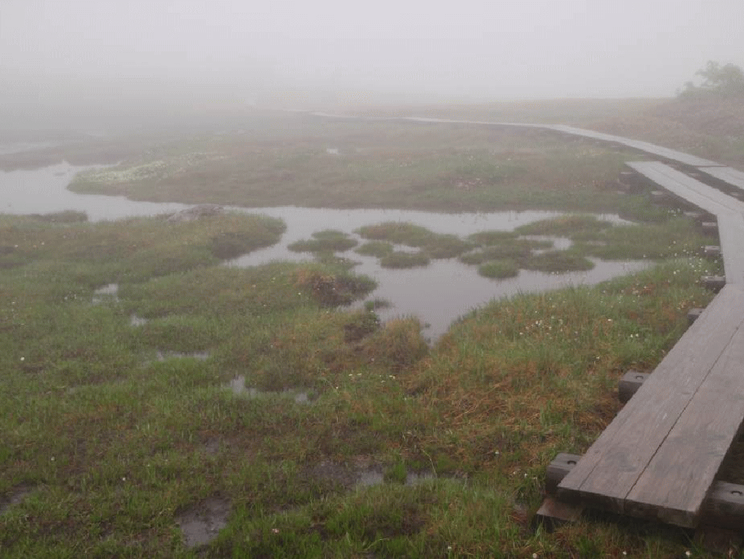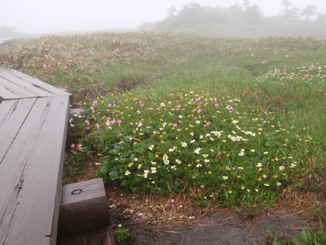 霧雨で視界が利かなかったが、湿原の高山植物が咲き乱れていた。天気の良い日にまた登りたい山だ。